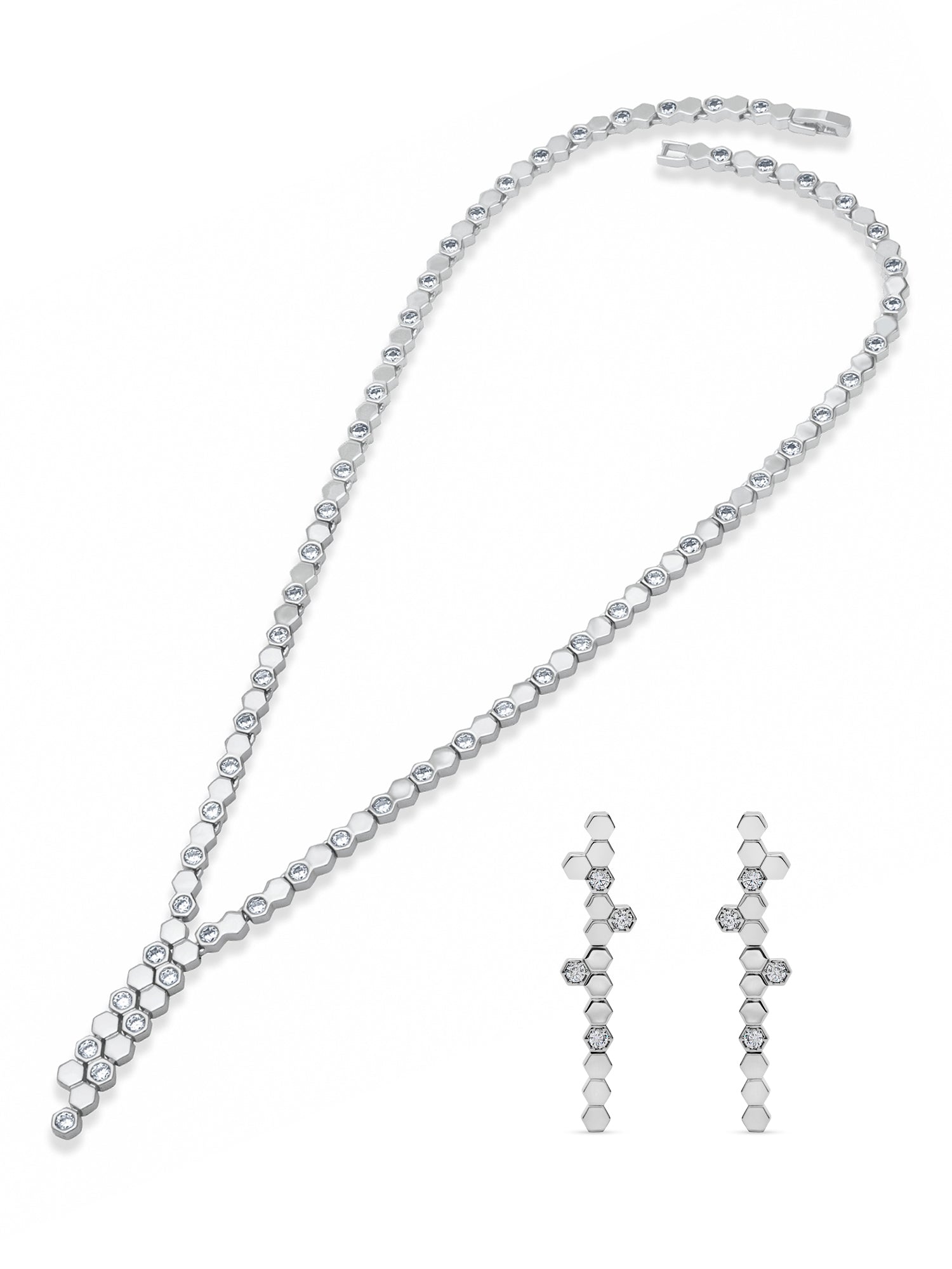Hexa Charm Twin Drop Necklace Set - Rhodium